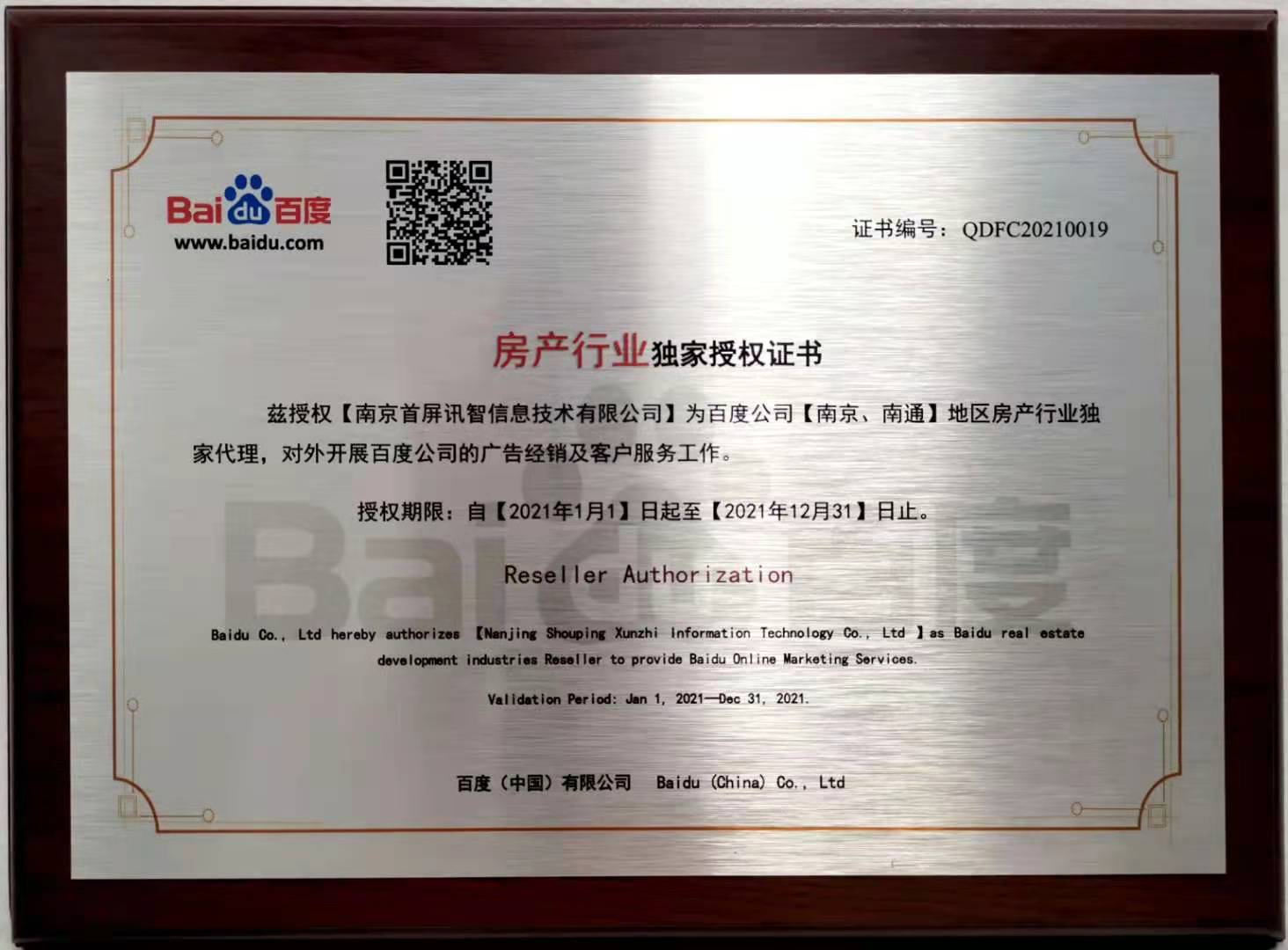 會(huì)上,百度公司正式授權(quán)南京首屏訊智信息技術(shù)有限公司為南京、南通地區(qū)房產(chǎn)行業(yè)獨(dú)家代理商及百度房產(chǎn)平臺(tái)南京、南通地區(qū)獨(dú)家運(yùn)營(yíng)商,并頒發(fā)授權(quán)證書(shū)。首屏訊智自2004年成為百度合作伙伴,始終致力于為廣大企業(yè)提供優(yōu)質(zhì)的互聯(lián)網(wǎng)營(yíng)銷服務(wù)。擁有17年豐富互聯(lián)網(wǎng)行業(yè)服務(wù)經(jīng)驗(yàn)的首屏訊智,已服務(wù)南京企業(yè)2萬(wàn)余家,助力廣大企業(yè)快速穩(wěn)健發(fā)展。